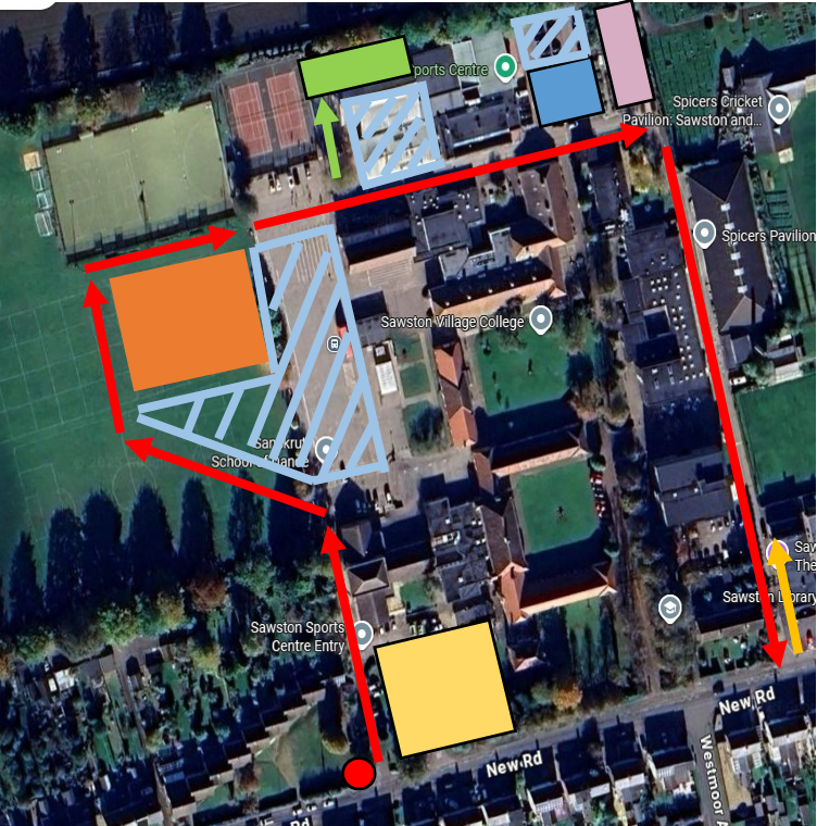 the site. For pedestrians and cyclists you can enter as above or via the pedestrian gate next to the Marven Centre (yellow